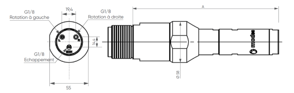 | Référence | Rapport de réduction | Pression (Bars) | Vitesse (tr/min) | Couple (Nm) | Puissance max (W) | Consommation d’air (Nl/min) | Dimensions | |||||