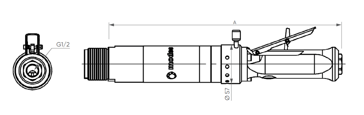 | Référence | Rapport de réduction | Pression (Bars) | Vitesse (tr/min) | Couple (Nm) | Puissance max (W) | Consommation d’air (Nl/min) | Dimensions | |||||
