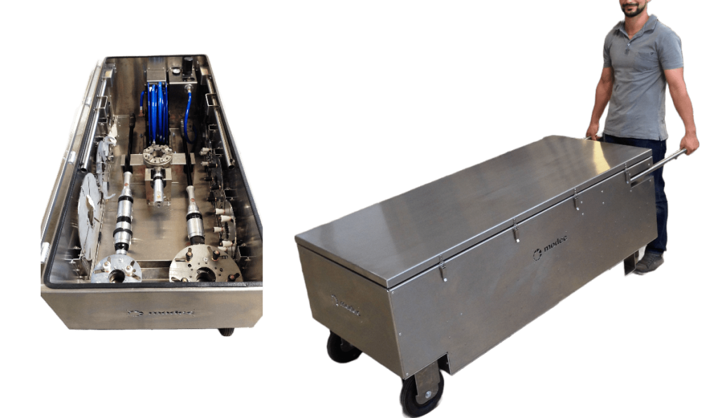 La modec Kit box peut être placée debout ou couchée, elle dispose de 2×3 roues afin de pouvoir être déplacée même dans des escaliers. L’intérieur est compartimenté de façon à ranger facilement et efficacement l’ensemble des éléments, mais aussi de pouvoir les mettre en œuvre rapidement. Elle peut par exemple contenir l’unité FRL et un tuyau d’alimentation en air sur enrouleur dans le cas d’un actionneur pneumatique.