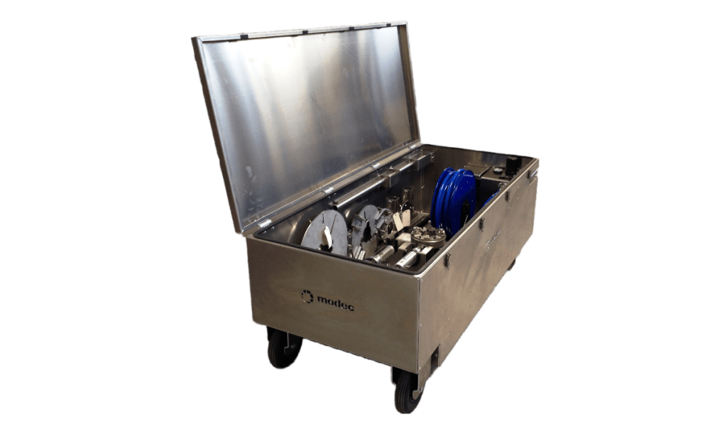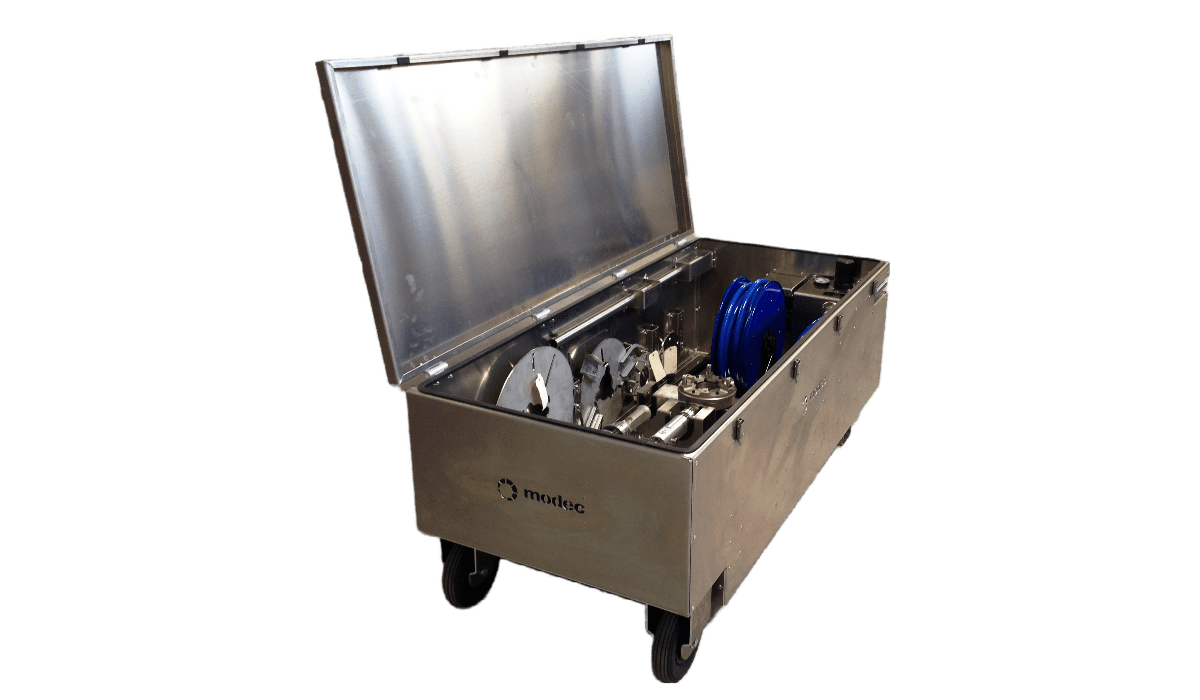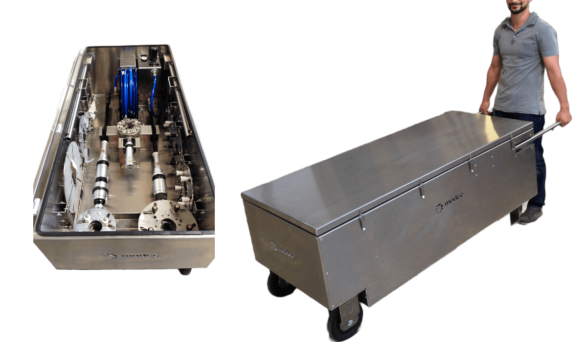 Destinée à un usage intensif et professionnel, la «modec kit box» est une caisse métallique pouvant contenir l’ensemble du matériel nécessaire aux opérations (actionneurs, adaptateurs, systèmes de reprise de couple, batteries, chargeurs, FRL, tuyau d’alimentation d’air…) de manière à pouvoir facilement transporter l’ensemble des éléments sur la zone de travail et de bénéficier d’une mise en œuvre rapide et facile.